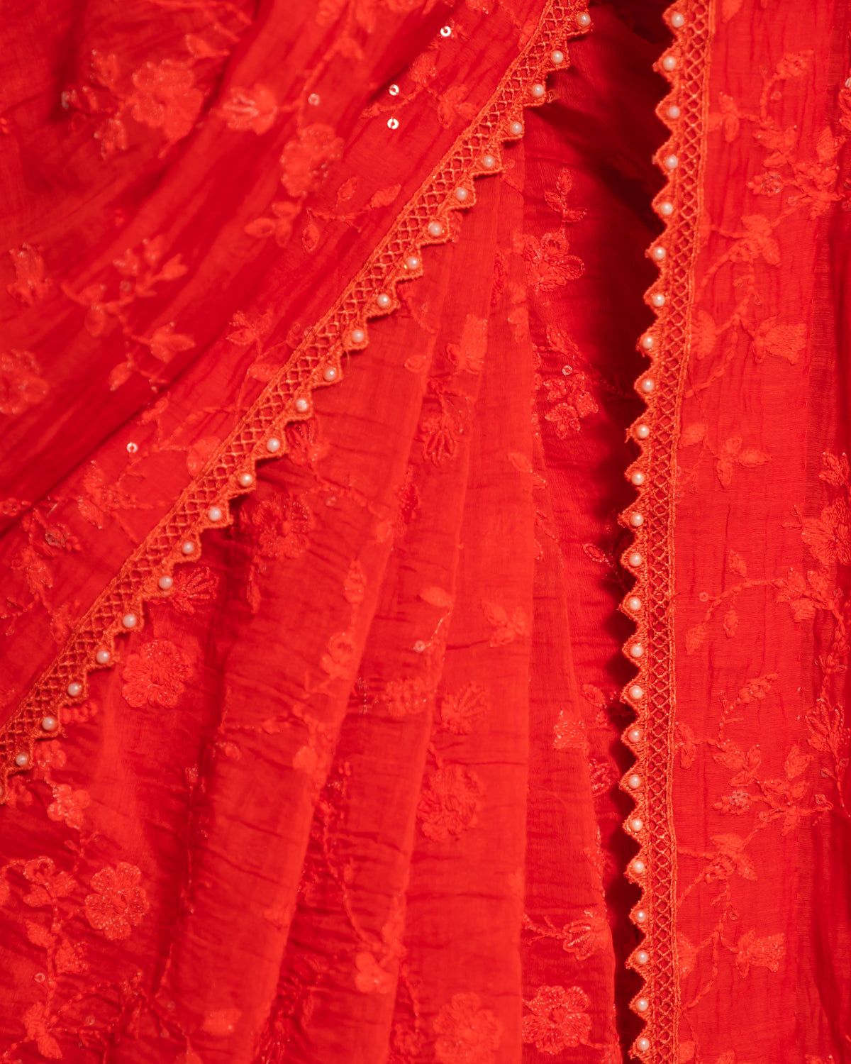 • Floral thread embroidery on pallu, bordered with hand-dyed cotton lace and pearls