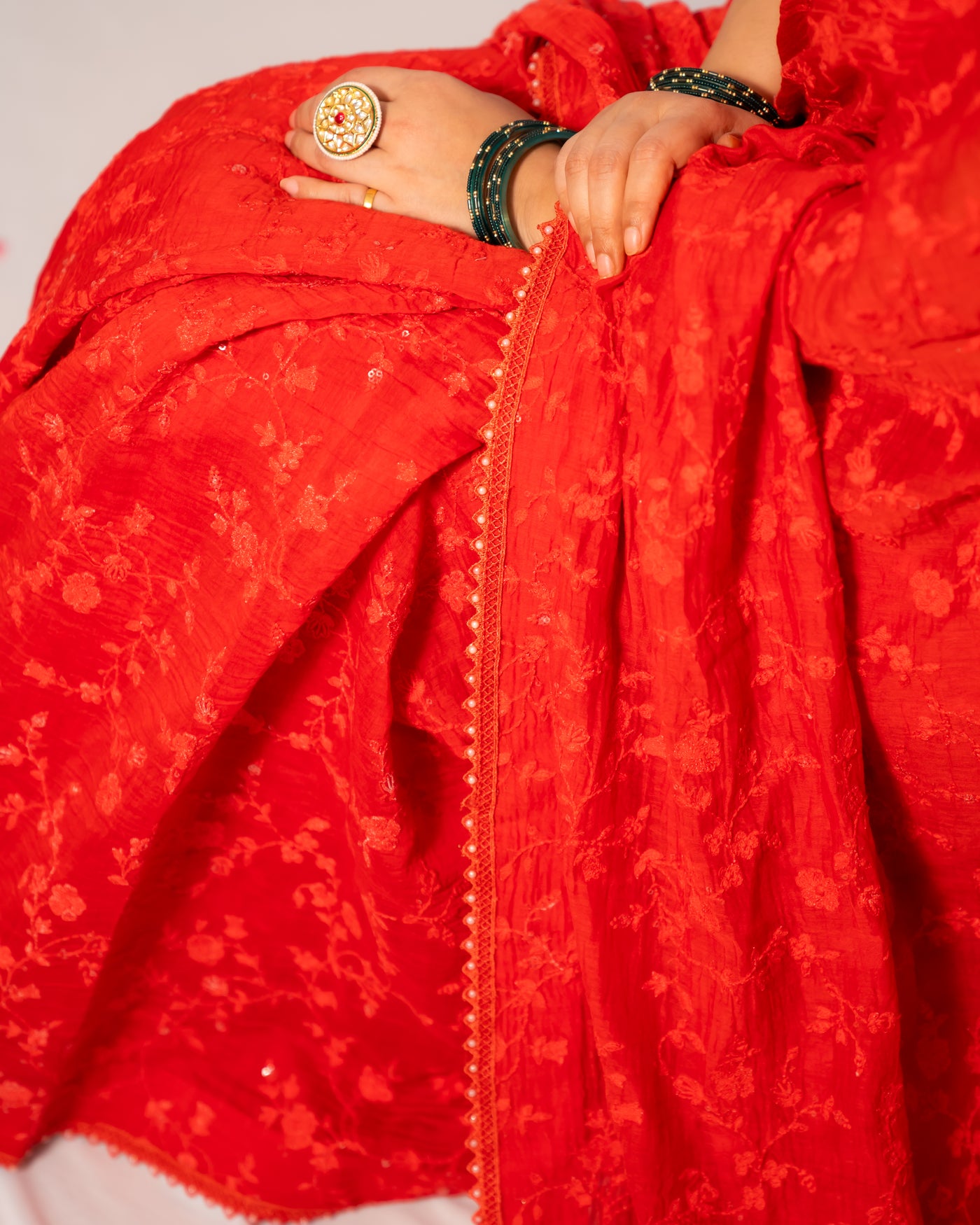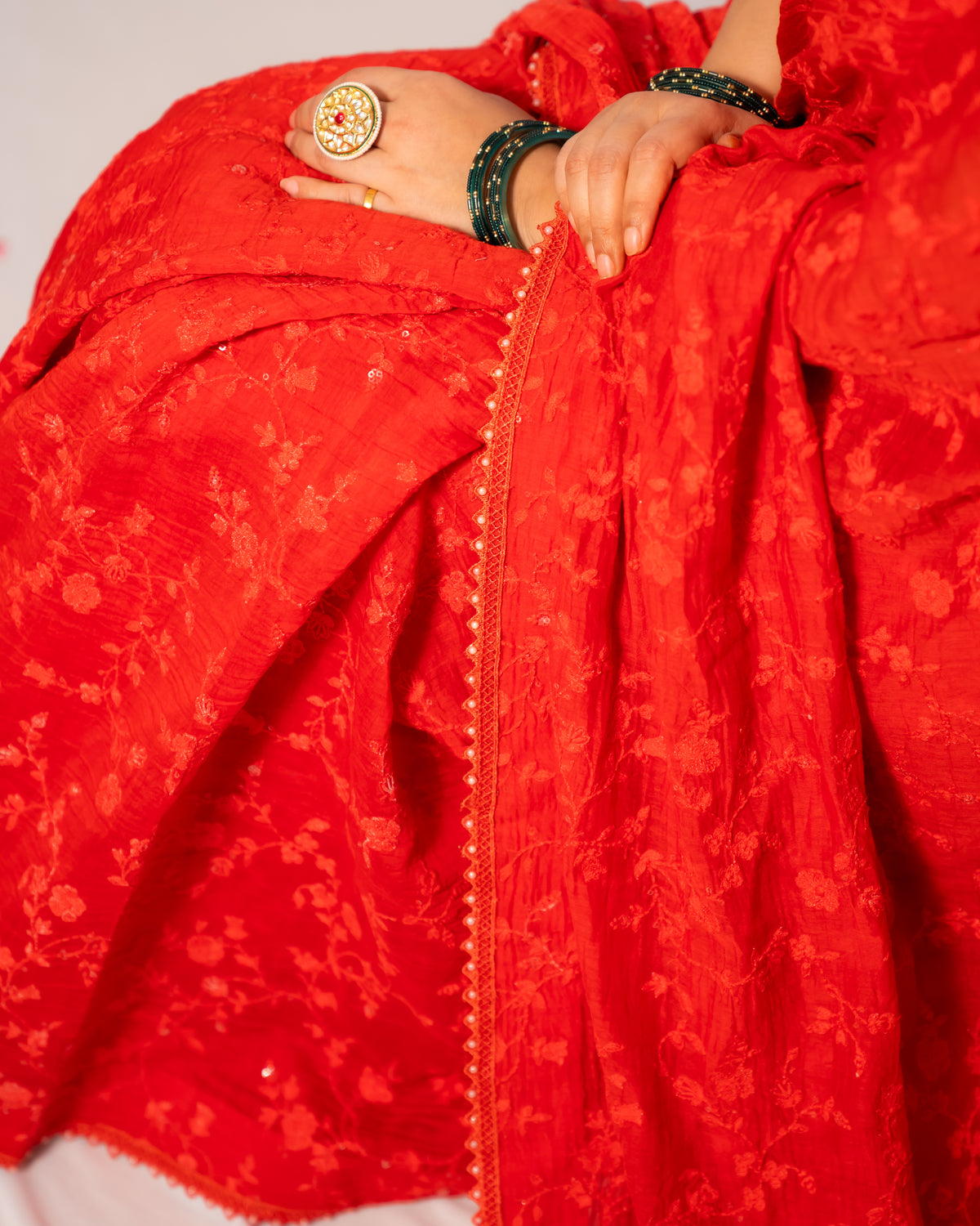 This soft red Chanderi saree carries festive warmth - detailed, grounded, and ready for celebration.