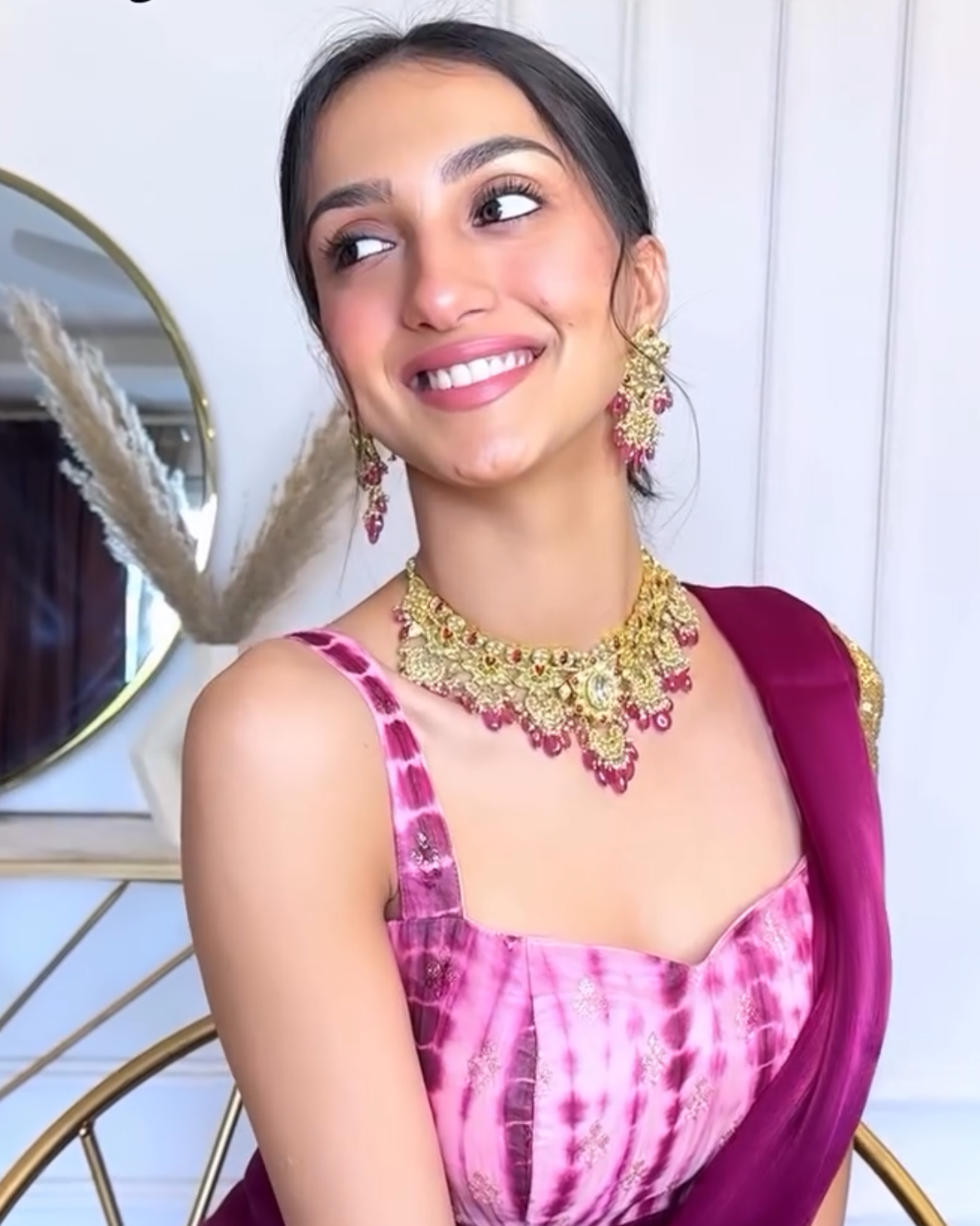 A velvety smooth organza saree, embellished with intricate gold laces and paired with a contrasting tie & dye organza blouse. For vivacious, adventurous woman of today. Wear it for semi formal occasions, date nights or even a girls' night out.