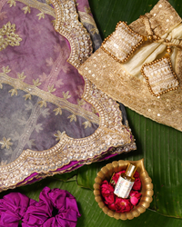 Royal, mysterious, and deeply enchanting, this organza dupatta is swathed in violets, lavenders, and regal purples, and adorned with golden thread embroidery. The shimmering mirror work scalloped lace elevates any outfit it is paired with!